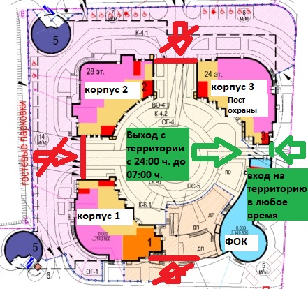 Уважаемые собственники и жители ЖК Зодиак! Сообщаем Вам, что с 9:00 ч. 01.04.2018 г. услуги по осуществлению пропускного режима в ЖК Зодиак будет осуществлять новая организация ООО ЧОО «Пересвет-Защита» в следующем порядке: ? Круглосуточный режим работы поста и осуществление пропускного режима на въезде в подземный паркинг дома остается без изменений. ? Круглосуточный выезд и въезд на наземную парковку через 1 и 3 ворота остается без изменений. ? Добавляется передвижной пост, который будет контролировать подземный паркинг и придомовую территорию. ? С 07:00 ч. до 24:00 ч. все посты в корпусах будут работать в обычном режиме с осуществлением пропускного режима непосредственно в корпусах дома. ? С 24:00 ч. до 07:00 ч.: • для обеспечения дополнительного отдыха сотрудников охранной организации в ночное время внутренний периметр дома будут обслуживать 2 сотрудника; • пропускной режим на внутреннюю часть дворовой территории и наружу будет осуществляться через ворота № 4 (между корпусом 3 и ФОК); • будут ЗАКРЫТЫ следующие внутренние калитки: - детский сад (1 корпус); - пожарный въезд между 1-ым и 2-ым корпусами; - пожарный въезд между 2-ым и 3-им корпусами. • контроль за входом на территорию будет осуществляться передвижным патрулем (в составе 2-х сотрудников), пост которого будет располагаться в корпусе 3; • для осуществления входа с наземной парковки на внутреннюю территорию дома/выхода на наземную парковку с внутренней территории дома через закрытые внутренние калитки необходимо обратиться (позвонить) к сотруднику охранной организации в корпусе 3 (тел.+7 (499) 557-09-82 доб. 4; +7 (929) 631-73-10). Просим Вас с пониманием отнестись к тому, что первый месяц работы сотрудникам ЧОО «Пересвет-Защита» необходимо познакомиться с жителями, чтобы в дальнейшем визуально определять гостей. Перед новой организацией поставлена задача исключения допуска посторонних лиц в ЖК Зодиак, поэтому просим Вам иметь при себе удостоверяющие личность документы. Дополнительная информация: • Схема прилагается. • Планируется оборудование внутреннего двора дома камерами видеонаблюдения и выведение просмотра с камер на пост корпуса 3 (до 06.04.2018 г.). • Планируется отработка оперативного взаимодействия сотрудниками центрального и внутренних постов для открытия внутренних калиток после заезда машины собственника на наземную парковку (для исключения необходимости звонка на пост охраны). • Планируется восстановление на калитках внутреннего двора домофонных панелей и магнитных замков.