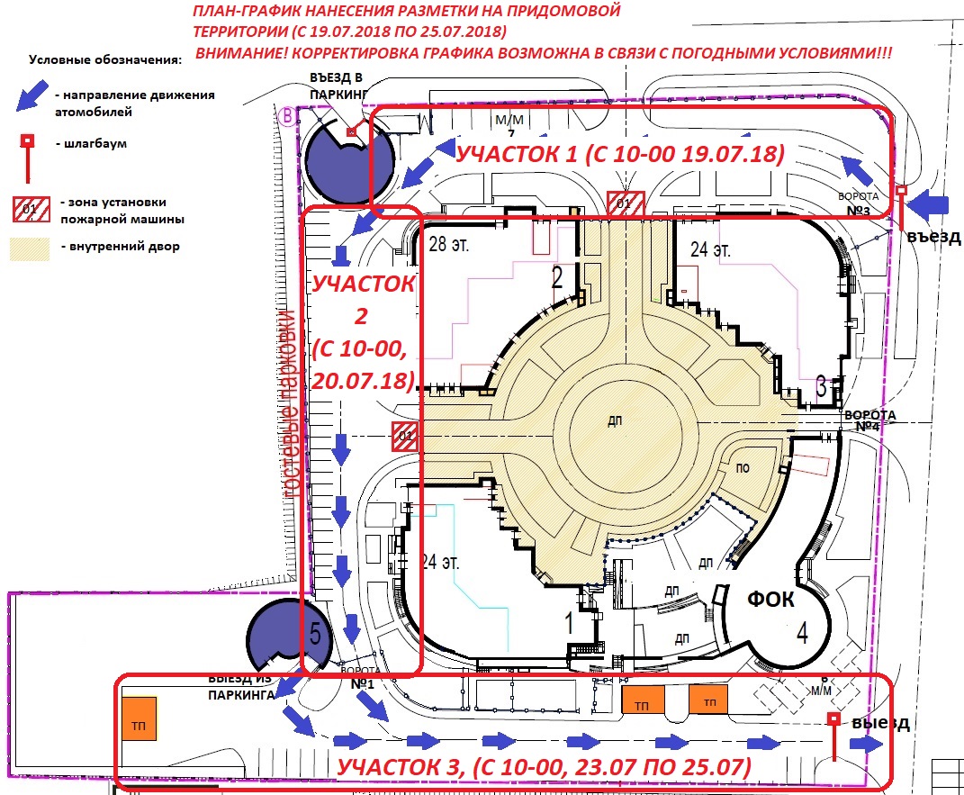 Уважаемые собственники помещений!!! Информируем Вас о проведении работ по нанесению разметки на парковочном пространстве и проезжей части придомовой территории в период с 19.07.2018 по 25.07.2018. Разметка будет наноситься в 3 этапа: 1й участок - от ворот №3 до въездной рампы на подземный паркинг (поворот за корпус 2), 2й участок - от въездной рампы до ворот №1, 3й участок - от ворот №1 до выезного шлагбаума возле "Гераклион". Схема прилагается. Оставлять автомобили в местах производства работ будет запрещено. Просим Всех, кто пользуется наземным паркингом оставить свои координаты для связи службе пропускного режима ЖК "Зодиак" по телефону 8 499 557 09 82 доб.4. Приносим свои извинения за доставленные неудобства. Внимание!!! Корректировка графика возможна в связи с изменением погодных условий. Администрация ТСЖ.